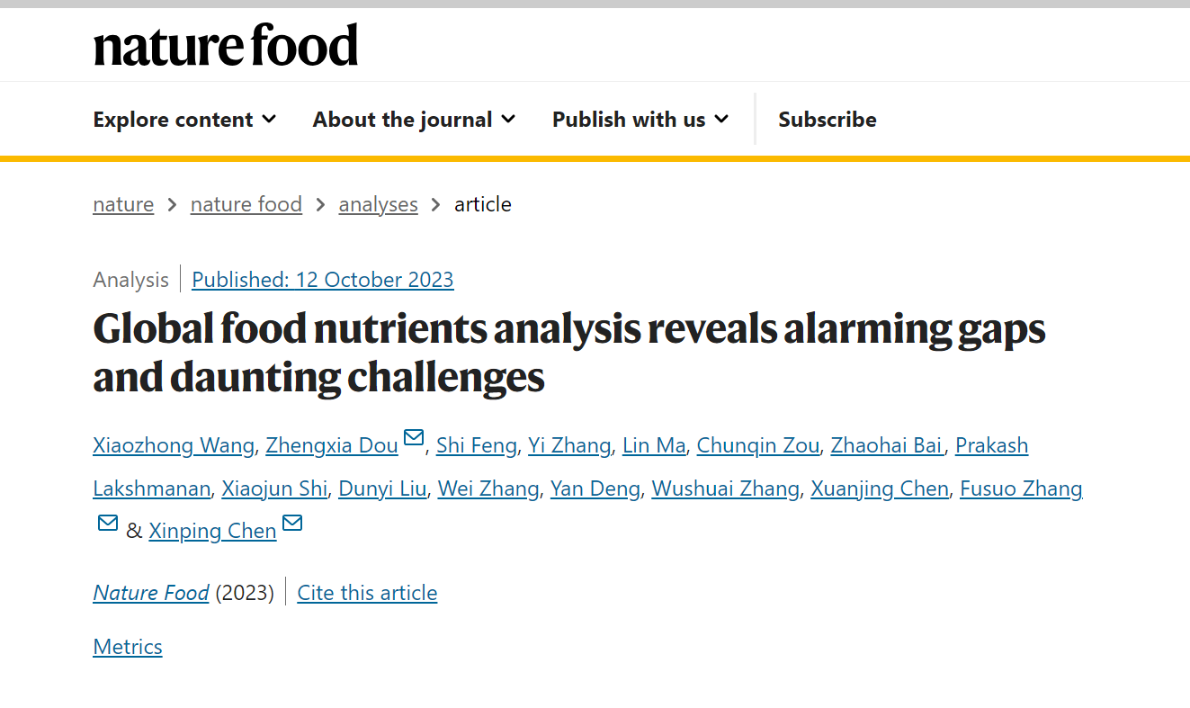 10月12日,学校资源环境学院、长江经济带农业绿色发展研究中心在Nature子刊Nature Food上发表研究论文《Global food nutrients analysis reveals alarming gaps and daunting challenges》。资源环境学院、长江经济带农业绿色发展研究中心王孝忠副教授、美国宾夕法尼亚大学窦正霞教授为共同第一作者,美国宾夕法尼亚大学窦正霞教授、长江经济带农业绿色发展研究中心张福锁院士和资源环境学院陈新平教授为共同通讯作者。