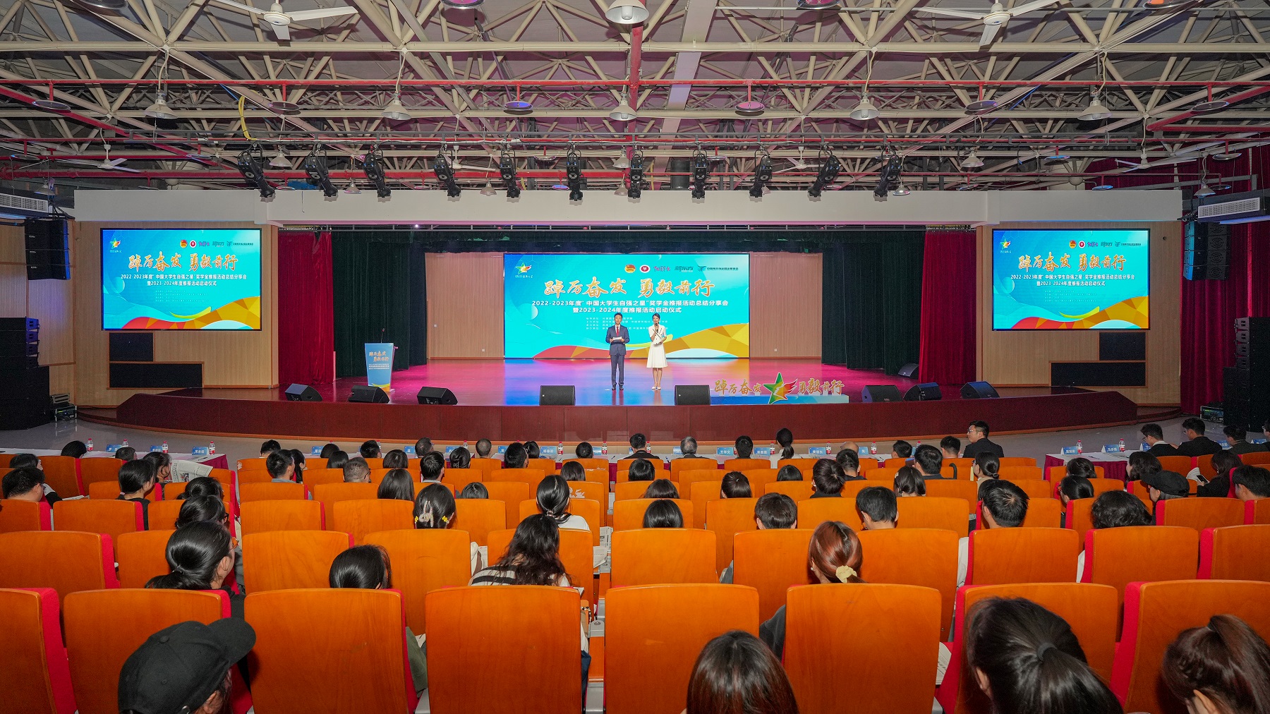 李旭锋在致辞中指出,“中国大学生自强之星”奖学金推报活动举办十余年来,已成为发挥优秀典型朋辈教育作用、激励广大青年大学生成长成才的标志性荣誉,成为高校落实立德树人根本任务、加强学生思想政治教育的重要抓手。希望学校以此次活动为契机,着力培养青年学子成为堪当民族复兴大任的时代新人,为中国式现代化建设贡献智慧和力量。