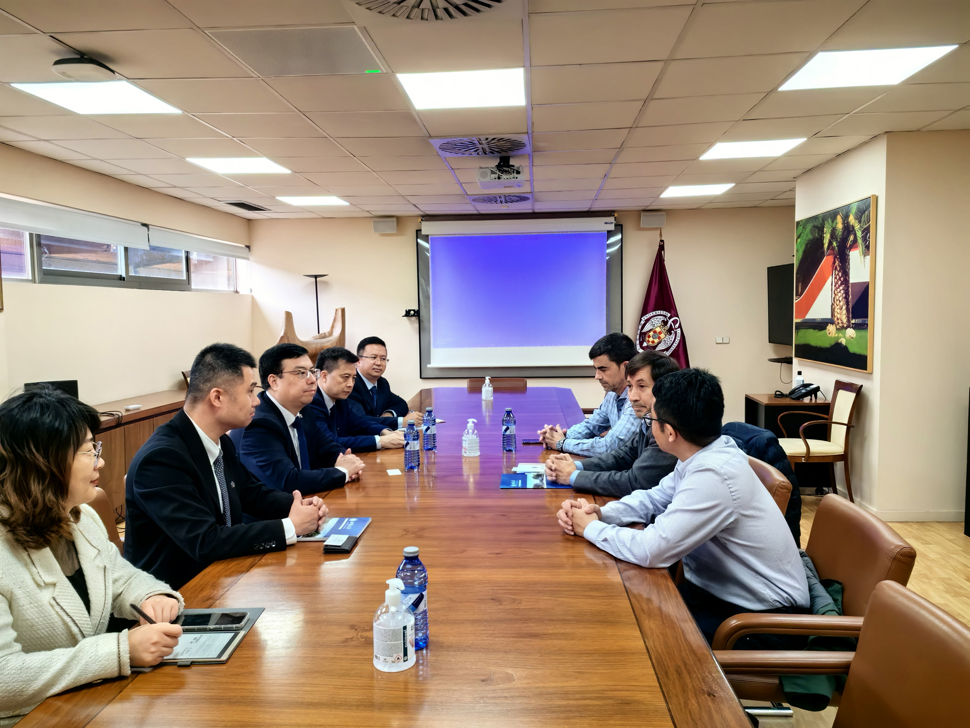 最后,王进军一行前往西班牙马德里康普顿斯大学,与副校长Miguel Angel Sastre、国际处及有关学院负责人进行了会谈。双方共同探讨了在药学、兽医学、农业与林业、经济学等领域开展包括但不限于“3+1”本科双学位、“3+2”本硕连读、硕士/博士联合培养项目,及国家留学基金委创新人才培养项目和高层次人才招聘等方面的合作。王进军代表学校邀请该校相关领域专家参加西南大学国际课程周,增进两校师生相互了解,加深学术交流和科研合作,助推相关学院建立实质性的合作项目。
