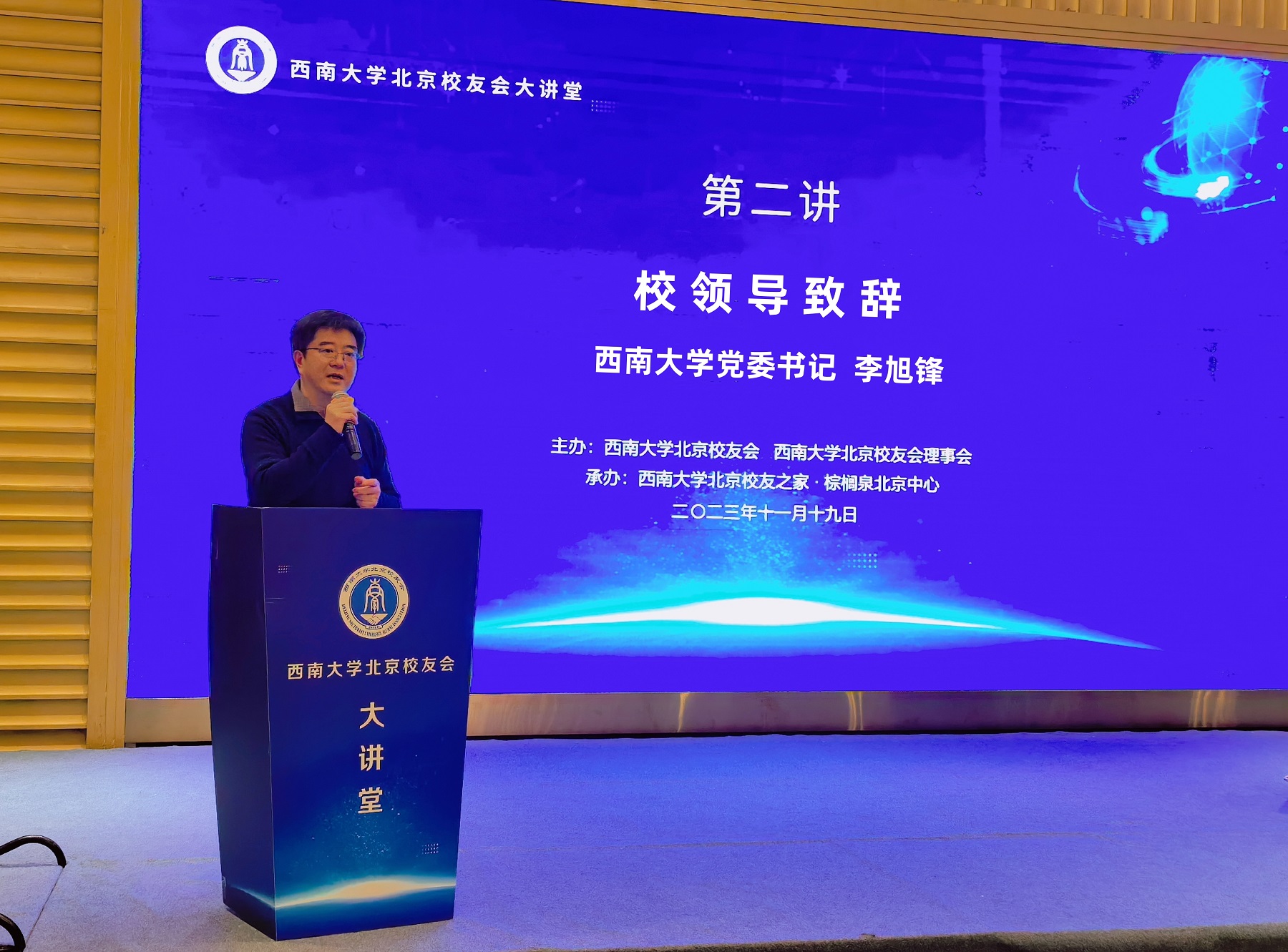 据悉,北京校友会大讲堂是第二届北京校友会理事会的品牌活动,邀请在京的学界、政界、商界、文化界的校友院士、专家教授、知名企业家和社会名流等开展专题讲座,并与校友就焦点问题互动交流,旨在为西南大学校友开阔眼界、更新知识、把脉社会经济动态、提高个人综合素养而建立的一个学习、互动和服务的平台。