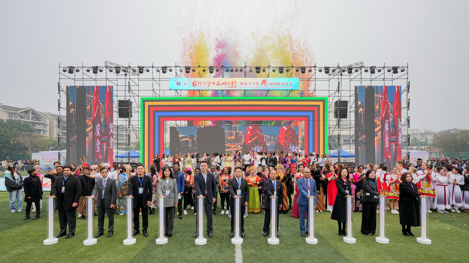 十载思路情,同聚五洲亲。12月10日下午,以“丝路筑梦 五洲同行”为主题的第十六届国际文化节在第四运动场拉开帷幕,来自100多个国家和地区的近千名国际学生参加本次国际文化盛典。中国教育国际交流协会,重庆市外办、市教委、市公安局出入境管理局、北碚区文旅委和区公安分局等部门相关领导,柬埔寨王国和缅甸联邦共和国驻重庆总领事馆总领事,巴基斯坦驻成都总领事馆代总领事,越南驻重庆工商部负责人,西南大学副校长周光明以及相关单位负责人出席开幕式。
