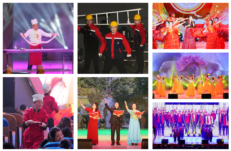 晚会分为“劳动欢歌”“勤深意切”“爱满人间”三个篇章,从后勤日常工作场景的欢快展现、后勤职工与师生相处的温暖故事,到后勤二十年踏实发展的片段回顾、优秀职工典型事迹的深情讲述,再到播放各部门新春祝福视频、共唱《相亲相家一家人》,层层铺开,步步深入。诗歌朗诵《樟兰齐香》述说打造美丽校园的心路历程,舞蹈《奋斗的基建人》展现投身学校建设的激情奋进,情景剧《毕业时,我给老师做餐饭》传递勤工学子的拳拳谢意,食堂师傅、绿化工人、维修工人现场炫技,做拉面、剪绿植、应急抢修,后勤“看家本领”精彩呈现……一个个精心编排的节目引得现场掌声不断。