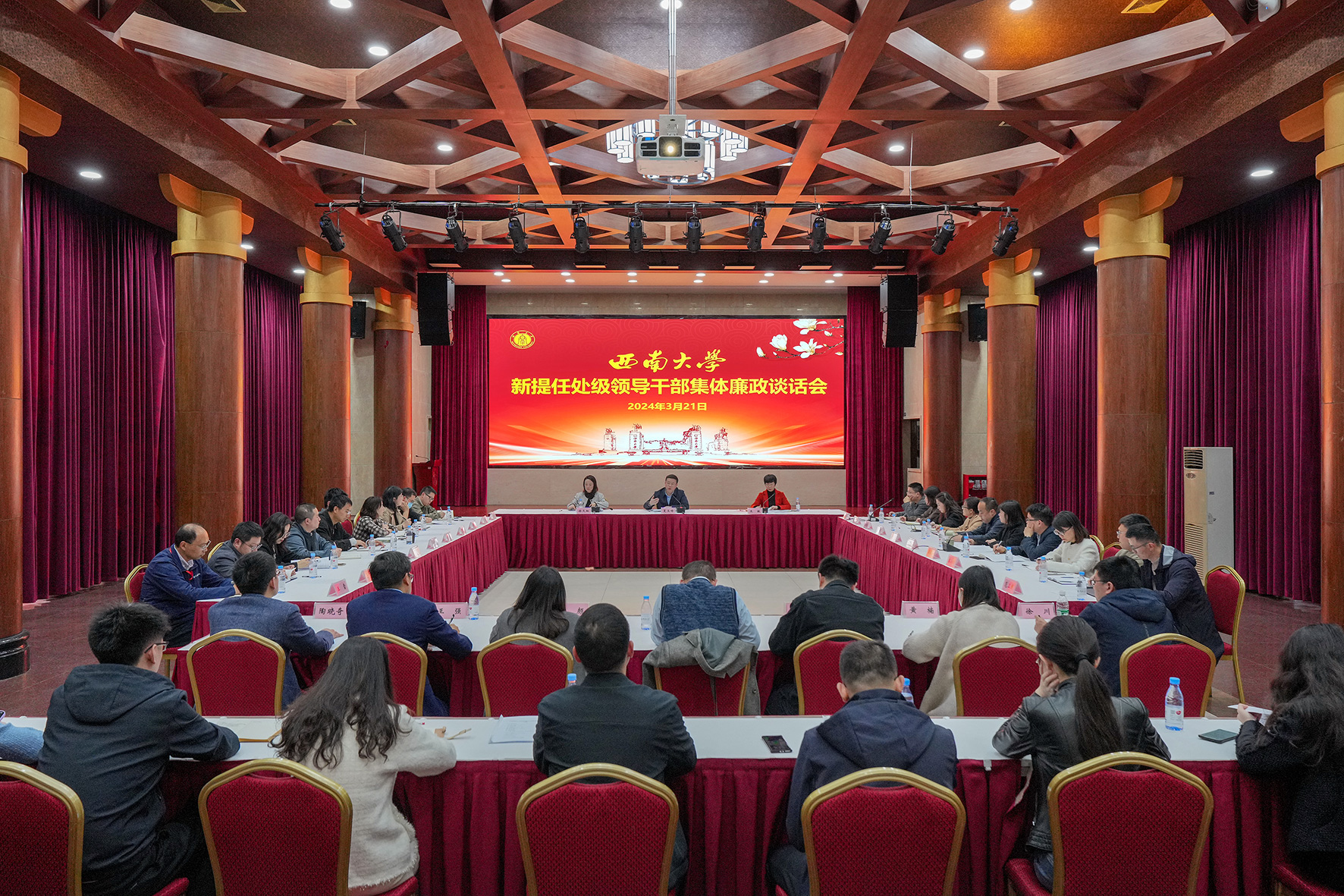 夏玉峰作集体廉政谈话,勉励新提任处级领导干部并提出要求,一是要深刻把握习近平总书记对年轻干部的要求,练好内功、提升修养,努力成为可堪大用、能担重任的栋梁之才。二是要深入学习贯彻全面从严治党的要求,准确把握习近平总书记关于党的自我革命的重要思想的精髓要义,坚决贯彻推进自我革命“九个以”的实践要求,并结合工作实际落细落实。三是要筑牢拒腐防变思想道德防线,用工作实效为学校高质量发展贡献力量。要做到严格遵守党的政治纪律和政治规矩,不断提升政德修养、涵养师生情怀,常态长效深化落实中央八项规定精神,勇于担当作为、投身教育强国实践,努力在自己的工作岗位上干出更好的成绩。