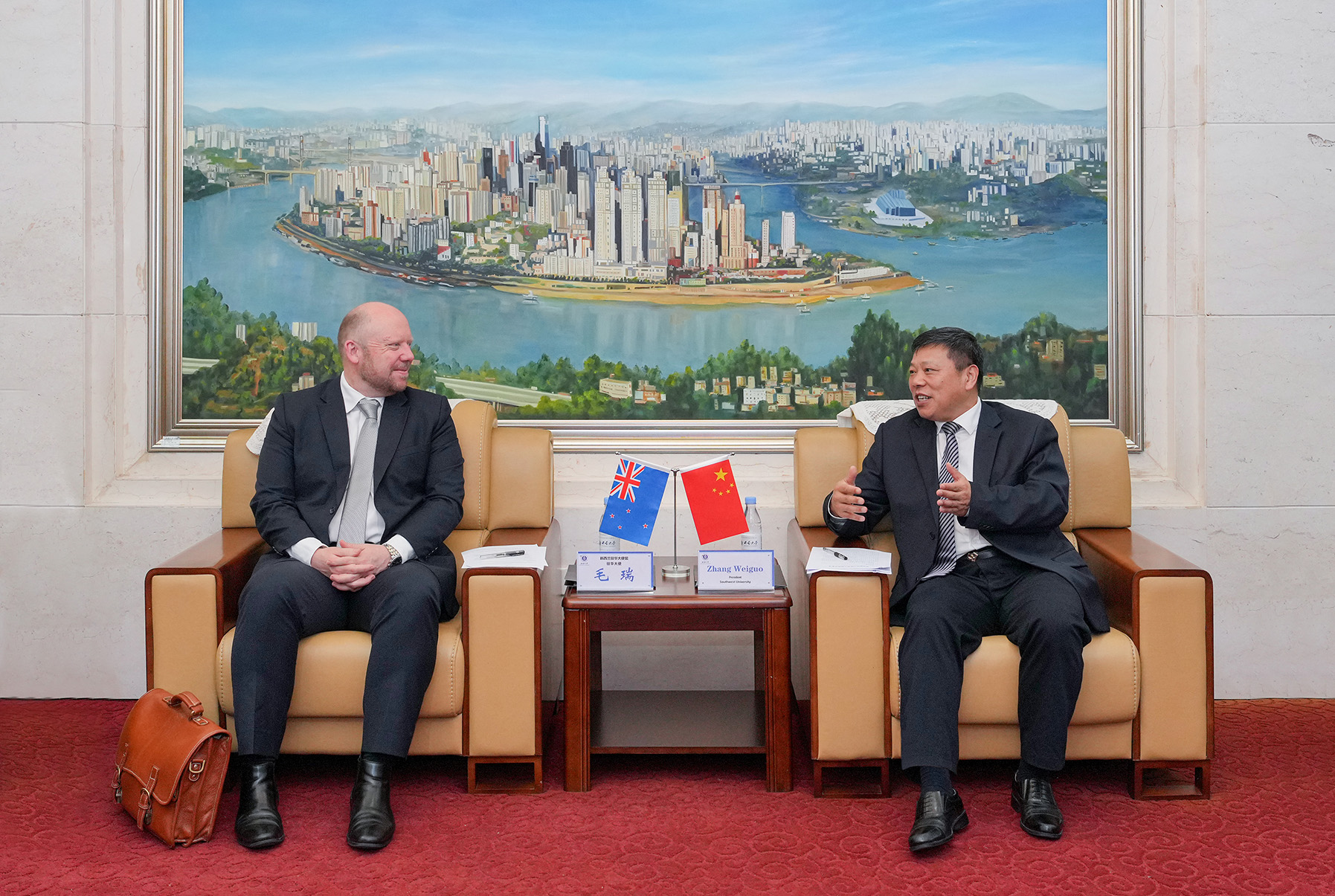 张卫国对毛瑞一行的来访表示热烈欢迎,简要介绍了西南大学及学校国际化的基本情况,回顾了学校与新西兰高校的合作情况。他表示,学校高度重视深化与新西兰高校的合作关系,希望以此次大使来访为契机,进一步拓展和深化学校与新西兰高校的合作,实现优势资源共享与互补,共同推动两国教育与科研事业蓬勃发展。
