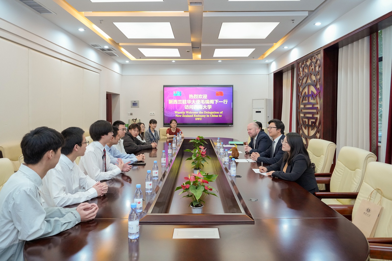 会后,毛瑞一行与学生代表进行座谈交流,欢迎同学们到新西兰学习。