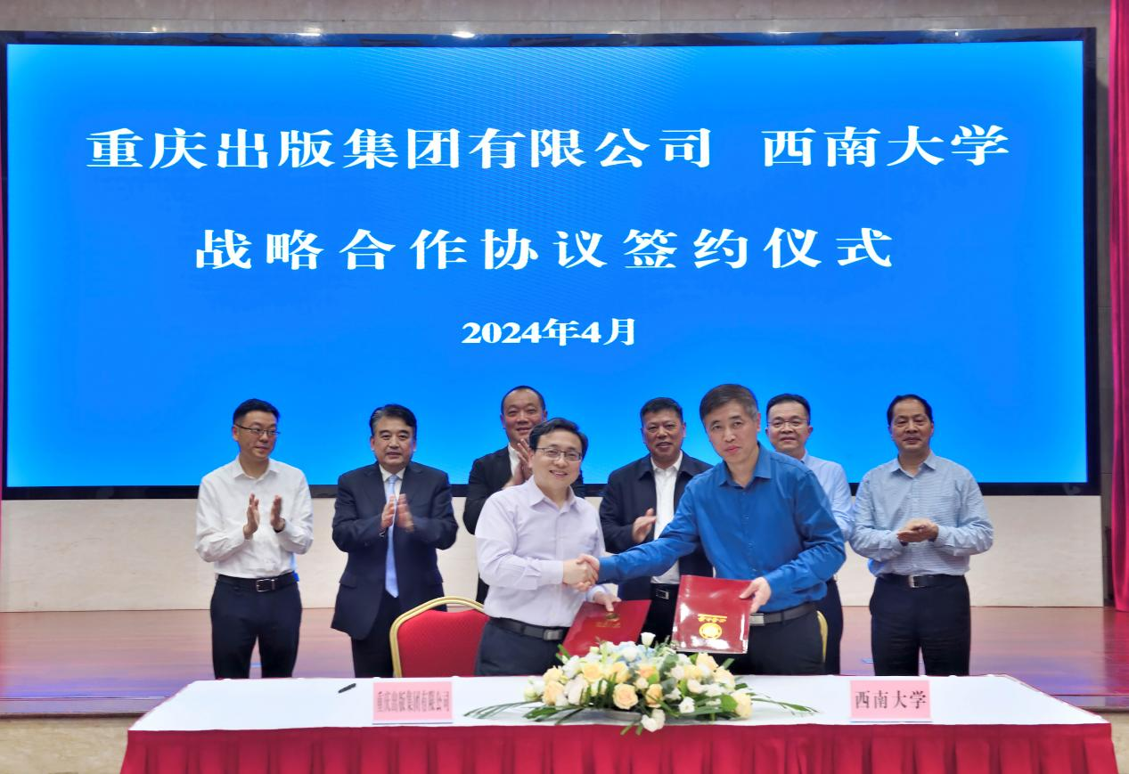 4月29日,“重庆出版集团有限公司 西南大学战略合作协议签约仪式”在东方红会议厅举行。重庆出版集团有限公司党委书记、董事长、总经理李斌,副总经理邱振邦,学校党委书记张卫国、党委副书记潘洵,高等学校出版专业教学指导委员会副主任委员兼秘书长、北京印刷学院原副校长王关义,市委宣传部出版处处长蒲洋出席仪式。重庆出版集团、学校有关部门负责人,专家学者代表参会。仪式由新闻传媒学院院长龙伟主持。