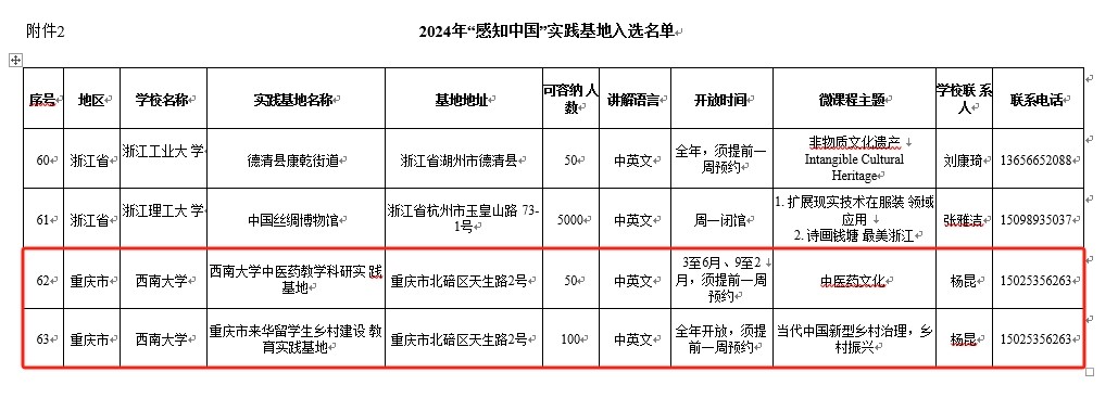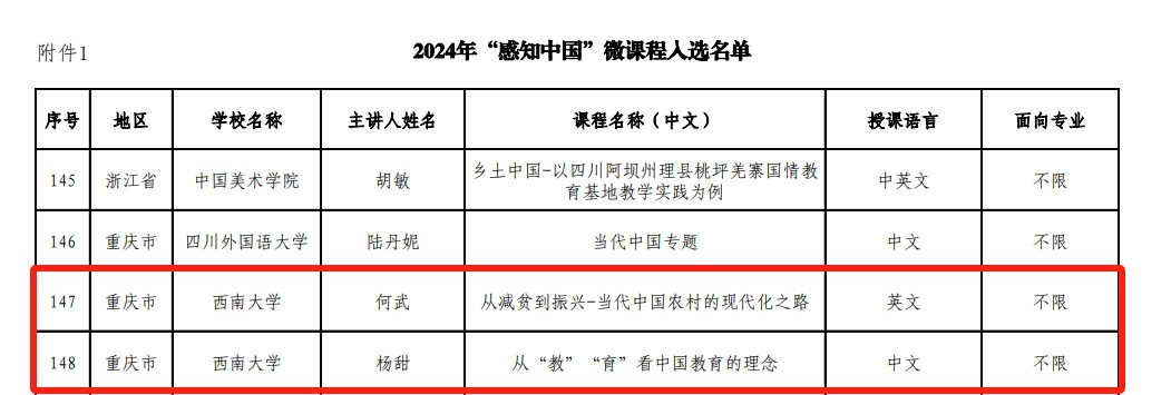由何武教授主讲的课程“从减贫到振兴——当代中国农村的现代化之路”和杨甜副教授主讲的课程“从‘教’‘育’看中国教育的理念”成功入选国情教育微课程,“西南大学中医药教学科研实践基地”和“重庆市来华留学生乡村建设教育实践基地”成功获批“感知中国”社会实践基地。届时,入选的微课程将在“CSC人才在线”平台展播,获批基地将接纳市内外留学生开展国情教育及社会实践活动。