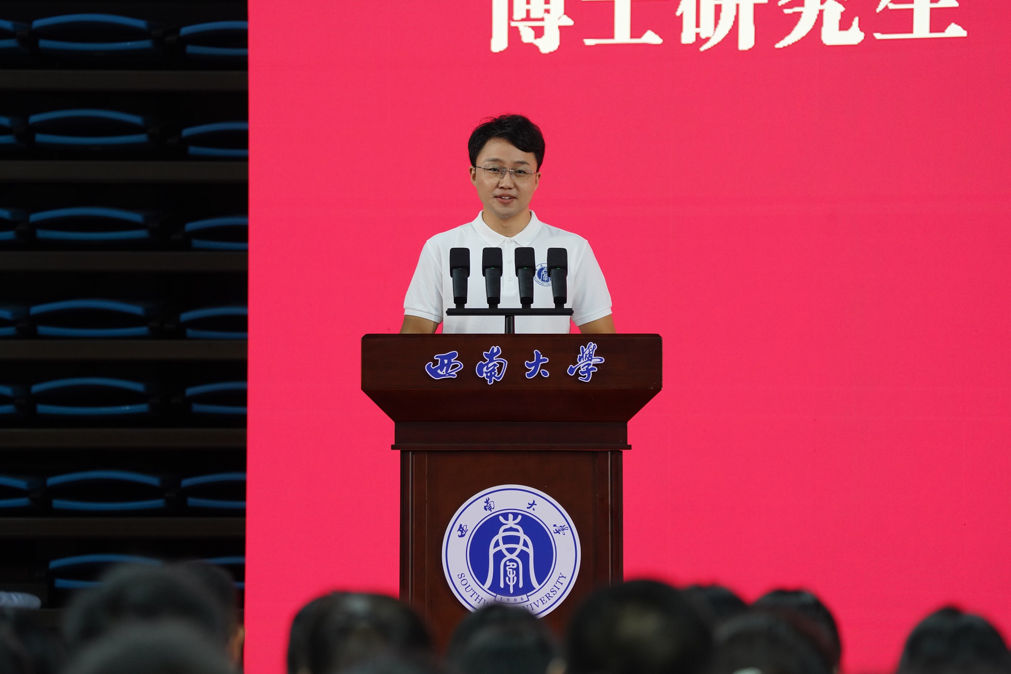 校长王进军讲话指出,希望新同学们在学术道路上铭记“研究”二字,始终追求卓越、勇攀高峰。他寄语大家首先在探索真知中报效国家,攀登志向的高峰。聚焦战略需求,立志“顶天”;心系民生福祉,着眼“立地”。其次,在传承创新中勇于突破,攀登学术的高峰。鞭策大家基础要牢,才能站得稳;视野要广,才能行得远;方法要活,才能增其效。再次,在求学求知中为人为事,攀登人生的高峰。勉励大家诚以立学,实以问道;敢为人先,踔厉奋进;功在积累,恒必有成。最后,他祝愿同学们在西南大学度过一段充实无悔的求学岁月,在沉浸而专注、持久而勤奋的研究中收获成功和喜悦,为建设特色鲜明的世界一流大学贡献力量,为以中国式现代化推进中华民族伟大复兴贡献青春。