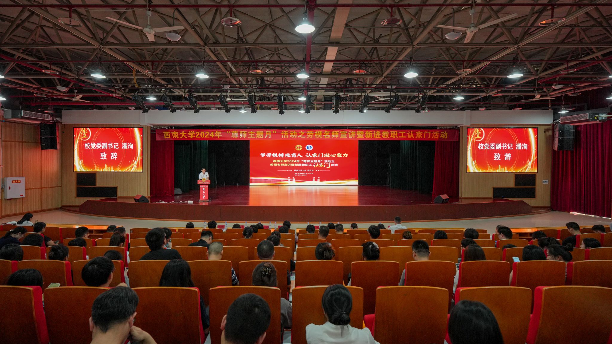 为充分发挥劳模名师在立德树人和师德师风建设中的示范引领作用,引导新进教职工以劳模名师为榜样,坚定躬耕教坛的决心和使命,9月27日下午,学校在圆顶三楼报告厅举办了“学劳模铸魂育人 认家门凝心聚力”劳模名师宣讲暨新进教职工认家门活动。党委副书记潘洵出席活动并致辞,相关职能部门负责人、各部门工会主席以及2024年新进教职工200余人参加活动。