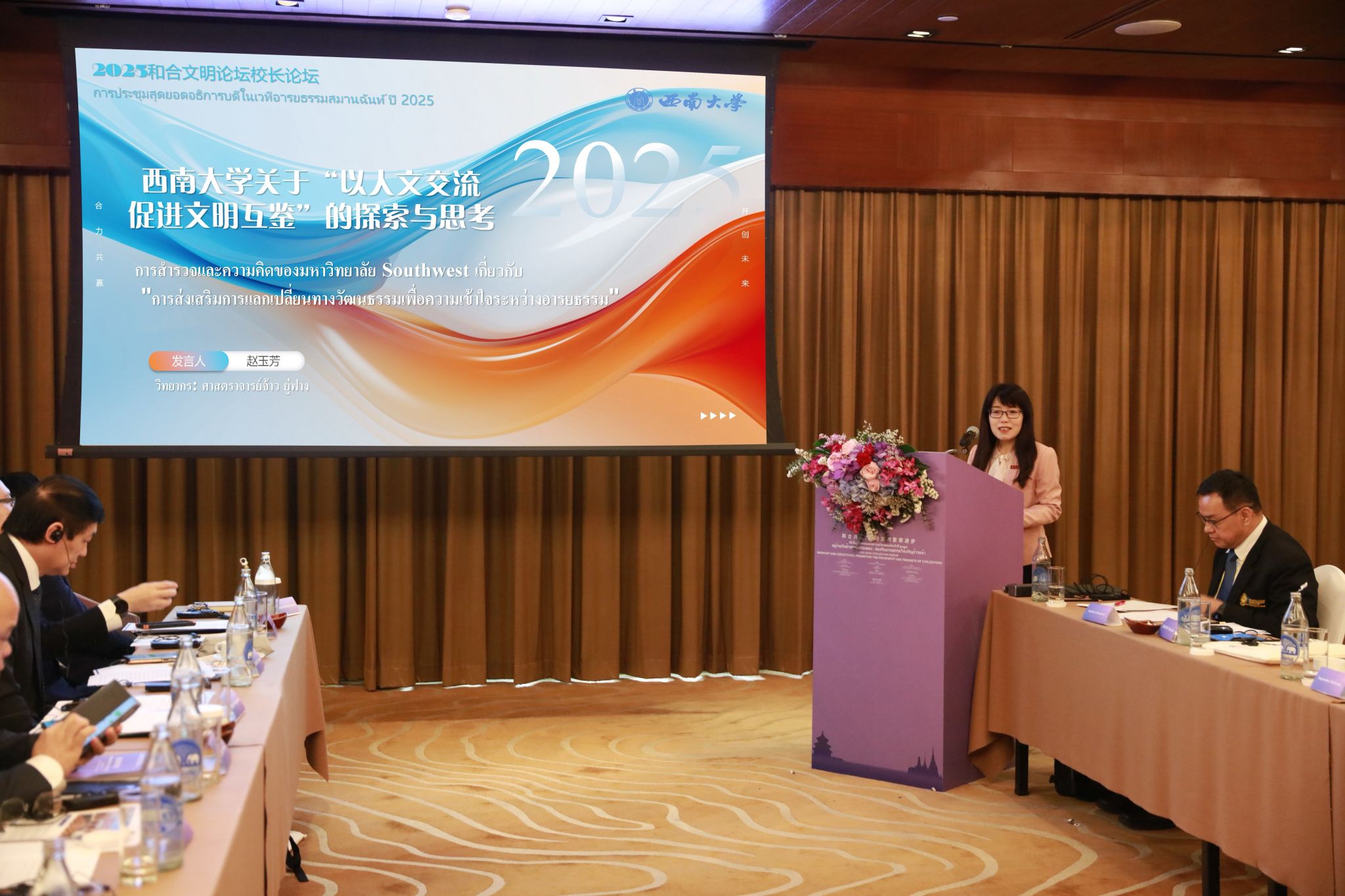 10日下午,赵玉芳在以“科技创新与人文交流”为主题的中泰校长论坛作主题发言,向与会嘉宾介绍了西南大学“以人文交流促进文明互鉴”的探索与思考。赵玉芳谈到,近年来,西南大学依托海外国际中文教育机构、中希文明互鉴中心等交流平台,以数智赋能,创新交流机制,积极推动与各国的文明互鉴。她表示,未来学校将继续践行“平等、互鉴、对话、包容”的文明观,为推动全球文明互鉴,贡献西大智慧和力量。
