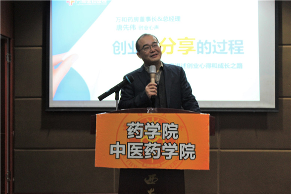 签约仪式上,杨坚副书记宣读签约内容,表示双方主要合作方向是建立西南大学药学院教学药房,拟在西南大学药学院新大楼建立万和智慧药房,设立万和医药奖学金等五个方面。胡昌华院长代表药学院与唐先伟董事长进行签约仪式。随后,唐先伟董事长作了“创业是分享的过程”为题的精彩报告。