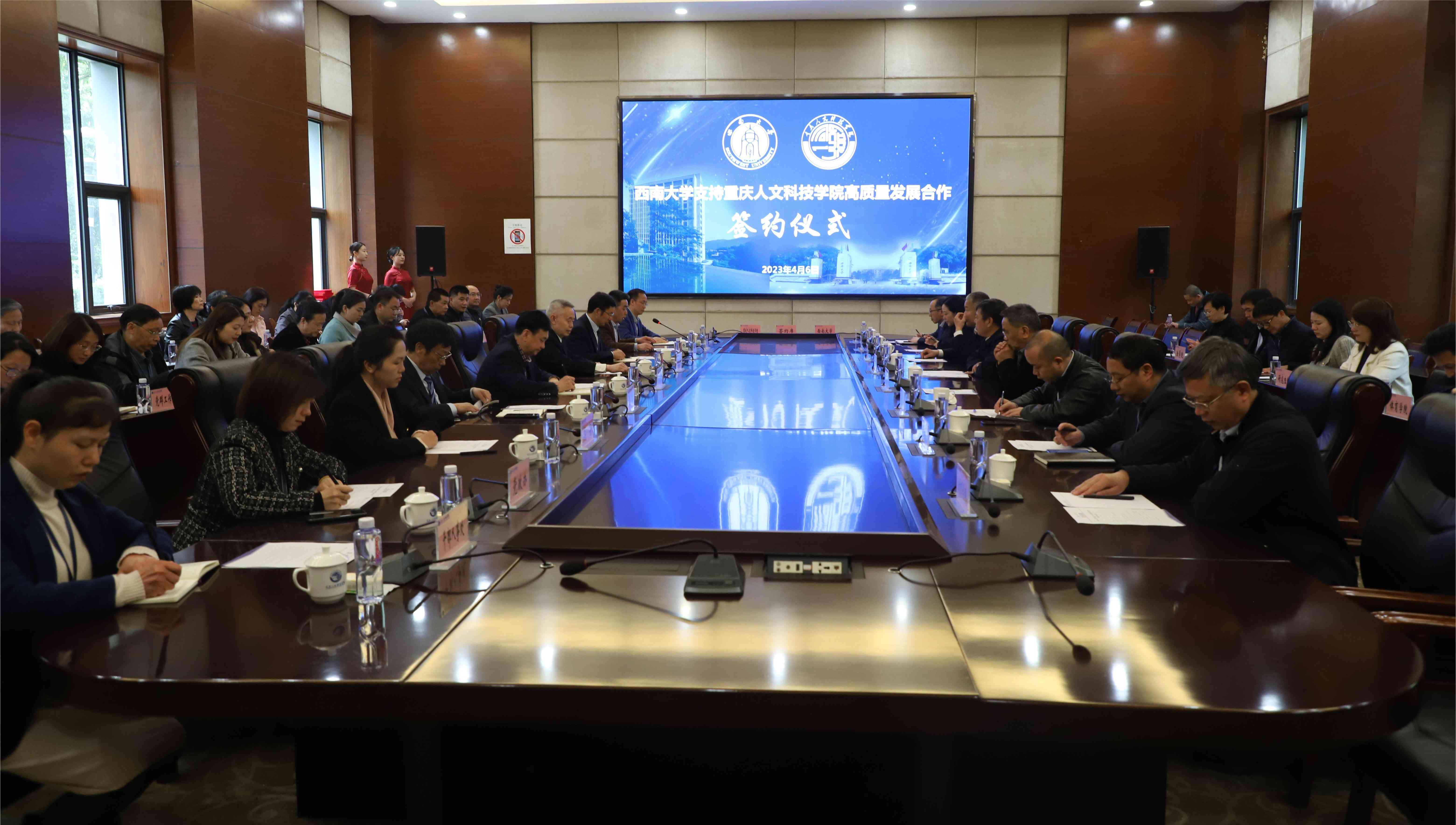 会上,葛信勇、曹勇分别代表两校签署《西南大学支持重庆人文科技学院高质量发展合作框架协议》,双方相关部门学院签订了教师岗前培训、辅导员综合素质能力提升、专业建设与学科高质量发展等专项合作协议。