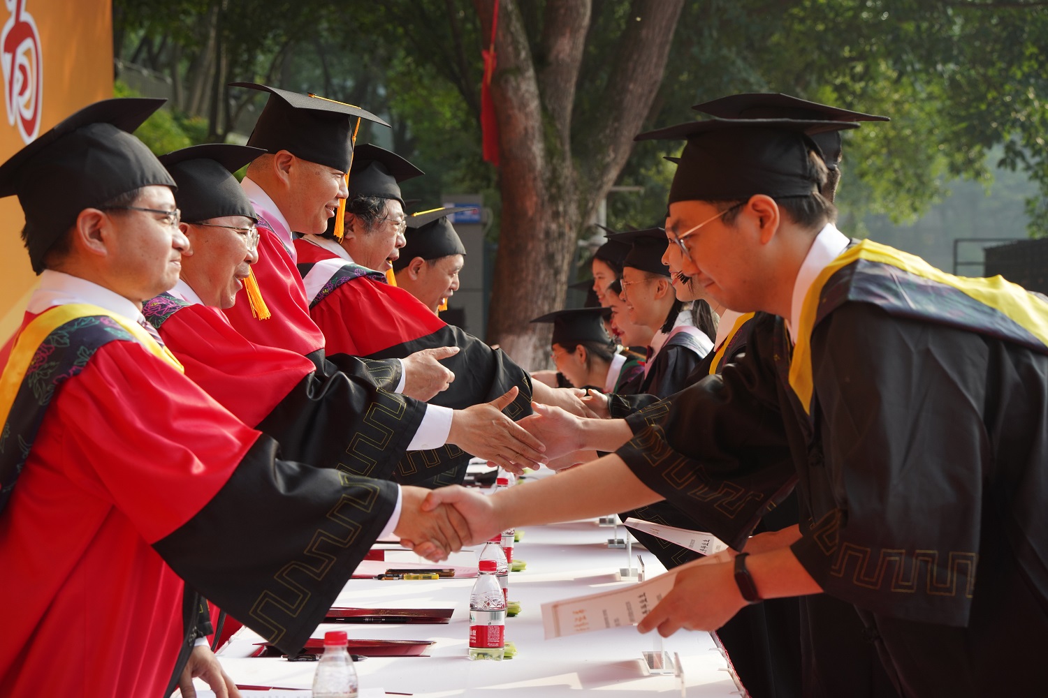 在激昂奋进的音乐声中,主席台领导、校学位评定委员会委员为获表彰的毕业生代表颁发荣誉证书,为毕业生代表颁发毕业证书并为学位获得者代表授位。