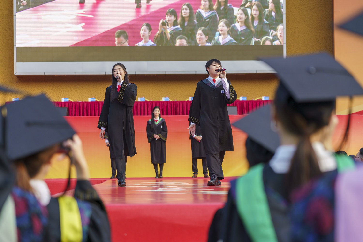 典礼开始前,全体毕业生唱响《天生之约》,共同带来《小城夏天》《如愿》《起风了》《奔跑的我们》等青春快闪节目,展现青年学子昂扬向上的精神风貌。典礼在庄严的国歌声中正式开始。