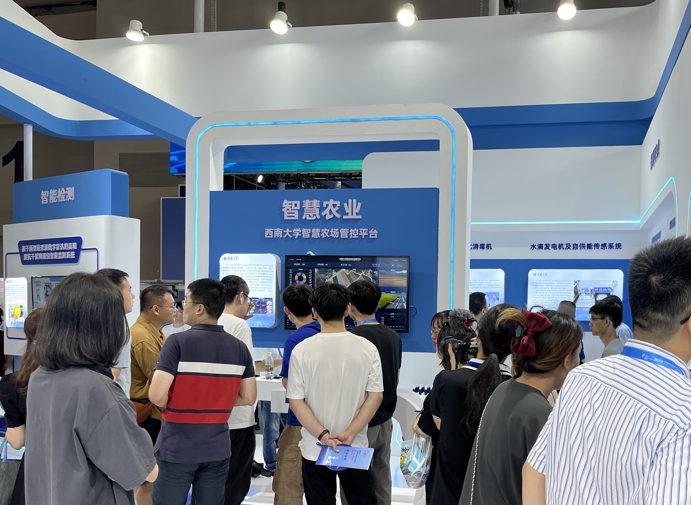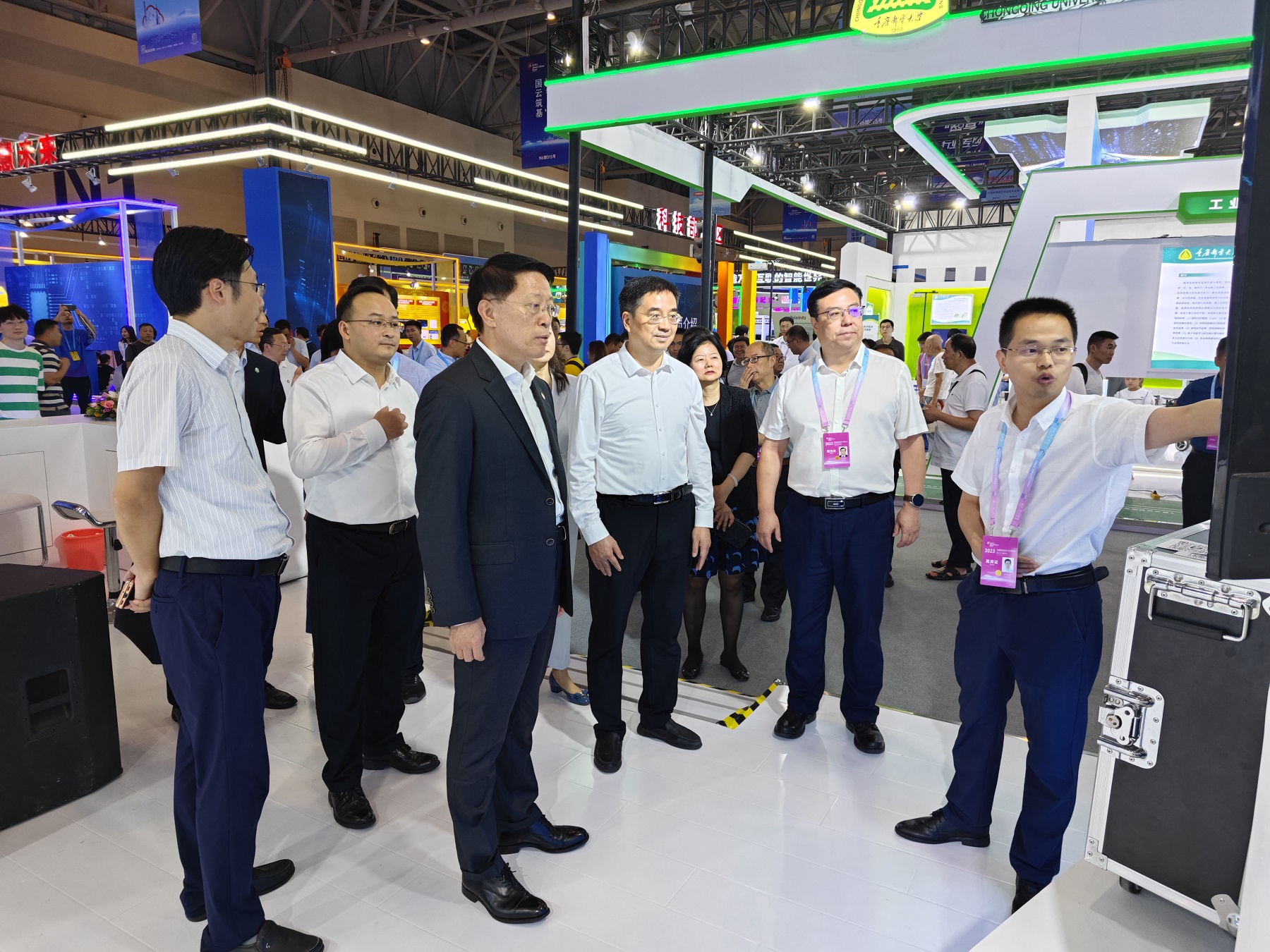 展会期间,重庆市副市长江敦涛,重庆市教育工委书记、市教委主任刘宴兵,市委教育工委委员、市教委副主任蒋云芳一行参观了西南大学展厅,副校长王进军陪同参观。江敦涛对学校在智慧农业、智能检测、生物智造等相关领域取得的成果给予充分肯定,鼓励学校结合自身学科优势,加快推进数字重庆建设,以数智化全面提升高质量发展能力,并亲切慰问了现场工作人员。