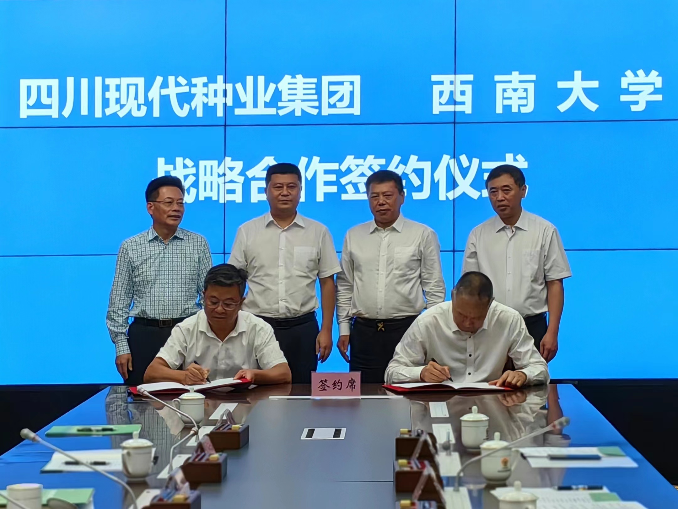 会上,易飞介绍了四川现代种业集团的基本情况及发展思路,表达了与西南大学合作共赢的美好愿望。葛信勇与易飞分别代表校企双方签署了战略合作协议,学校油菜科研团队、甘薯科研团队分别与四川现代种业集团科创中心签订了科技合作协议。协议约定双方将在品种研发、良种繁育、生产技术、人才交流和培养、技术平台建设、种业科技服务、市场推广服务等领域展开深入合作,促进创新资源优化配置,推动种业科研成果转化应用。