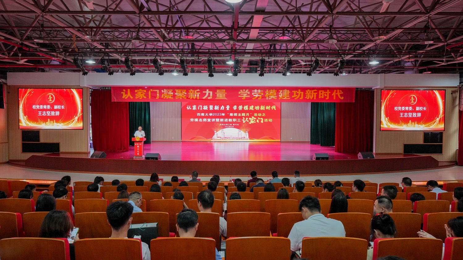 为充分发挥劳模名师在立德树人和师德师风建设中的示范引领作用,持续弘扬劳模精神、劳动精神、工匠精神,引导新进教职工以劳模名师为榜样,让劳动光荣、创造伟大的风尚润入人心,9月23日下午,校工会在学校圆顶三楼报告厅举办了以“认家门凝聚新力量 学劳模建功新时代”为主题的劳模名师宣讲暨新进教职工认家门活动。副校长王志坚出席活动,部分职能部门和学院相关负责人,各部门工会主席以及2023年新进教职工200余人参加活动。活动由校工会相关负责人主持。