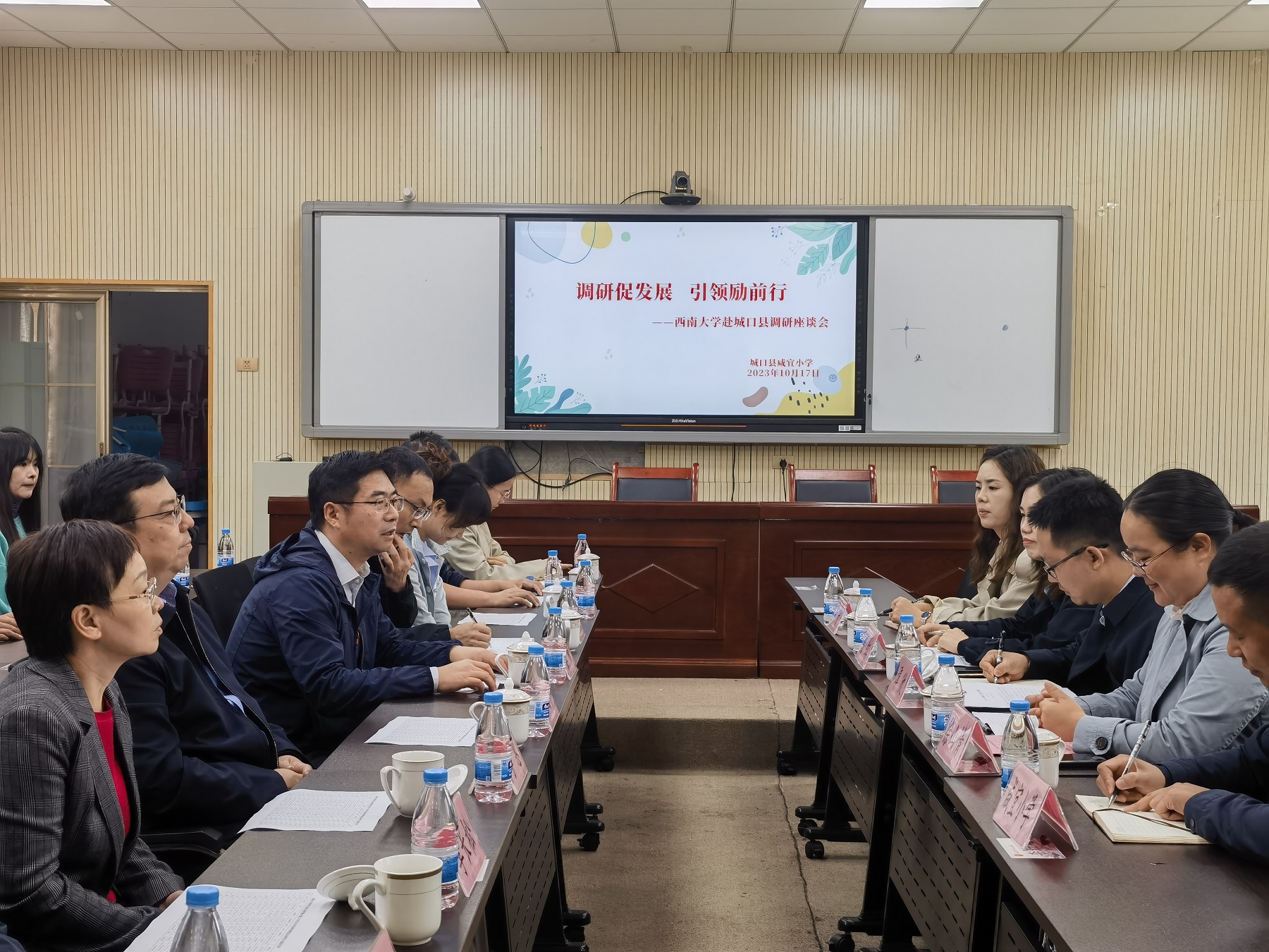 王进军一行与城口县委副书记袁开勇、县委常委张国进等就定点帮扶工作进行深入交流。先后前往修齐中学、咸宜小学看望顶岗支教研究生,并在咸宜小学座谈。市发改委帮扶集团驻镇工作队副队长谭欣、学校派驻城口挂职干部,城口县教委、咸宜镇、咸宜小学相关领导,以及学校派驻城口全体支教研究生志愿者参加座谈。